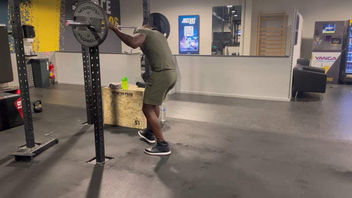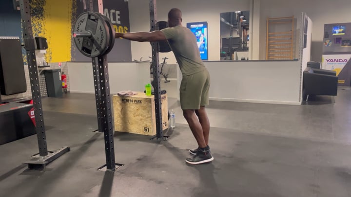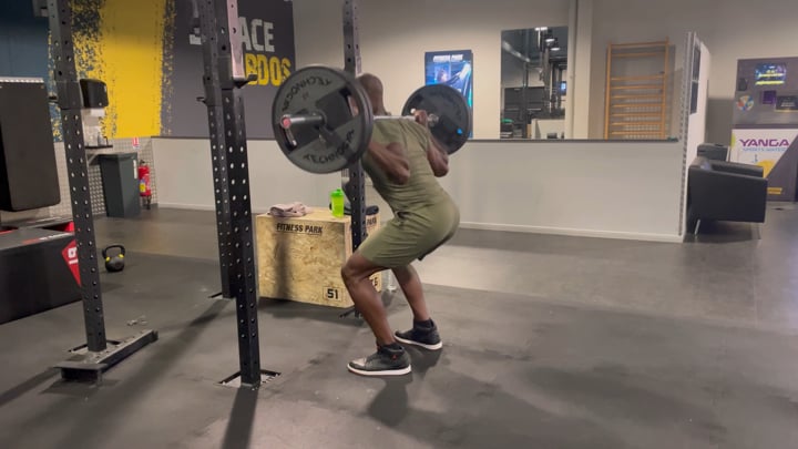 Nous allons saisir une barre pour le squat, en utilisant une charge légère dans le but de poursuivre notre échauffement articulaire et de bien préparer nos quadriceps.